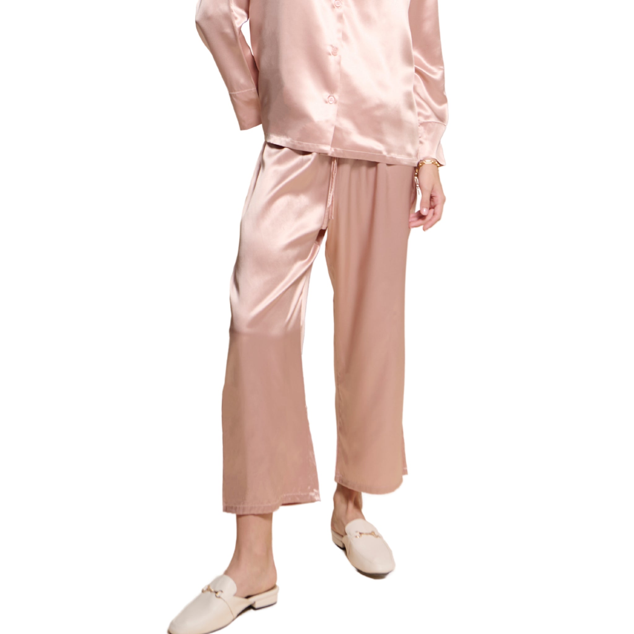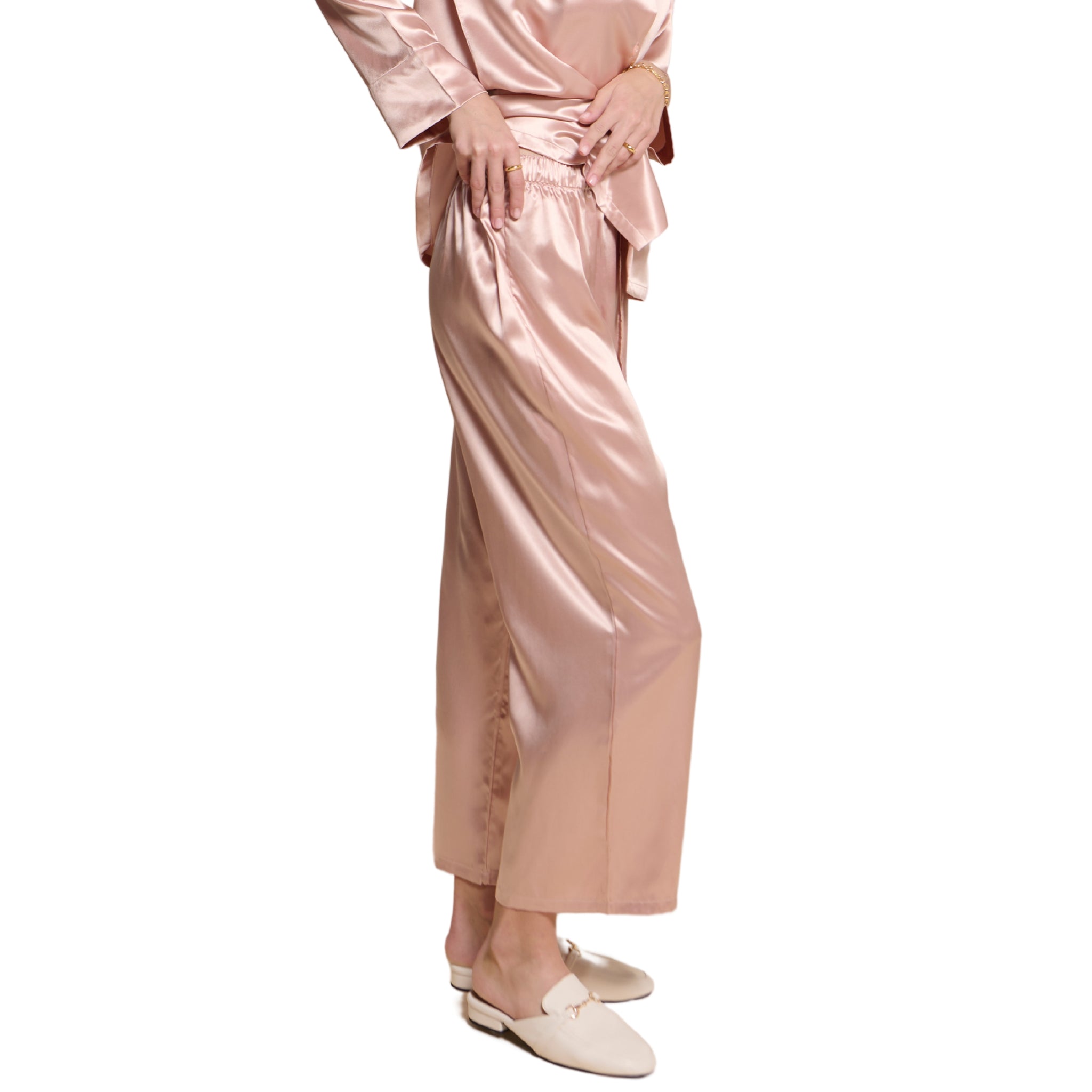 These Remi Pajamas pants are expertly crafted from 22 momme mulberry silk, ensuring a luxurious and indulgent feel. The loose fit straight pattern, coupled with a slightly drop-crotch design, makes these pants effortlessly stylish and suitable for all body types. With a silk strap and an elasticated waist, these pants guarantee a comfortable and adjustable fit for a perfect night's sleep. Pair them with either Remi Pajamas Shirt or Kelly Pajamas Shirt to create a coordinated and sophisticated ensemble.