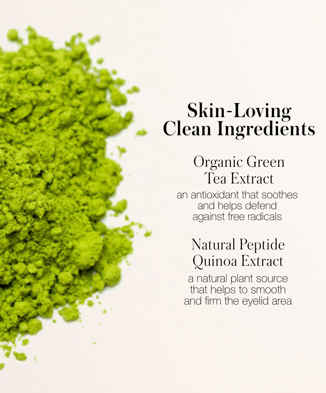 มีส่วนผสมของสารบำรุงผิวอย่าง Organic Green Tea & Natural Peptide Quinoa Extract ที่อุดมไปด้วยสารต่อต้านอนุมูลอิสระ ช่วยปลอบประโลม ลดริ้วรอยและช่วยให้ผิวบริเวณเปลือกตามีความกระชับขึ้น